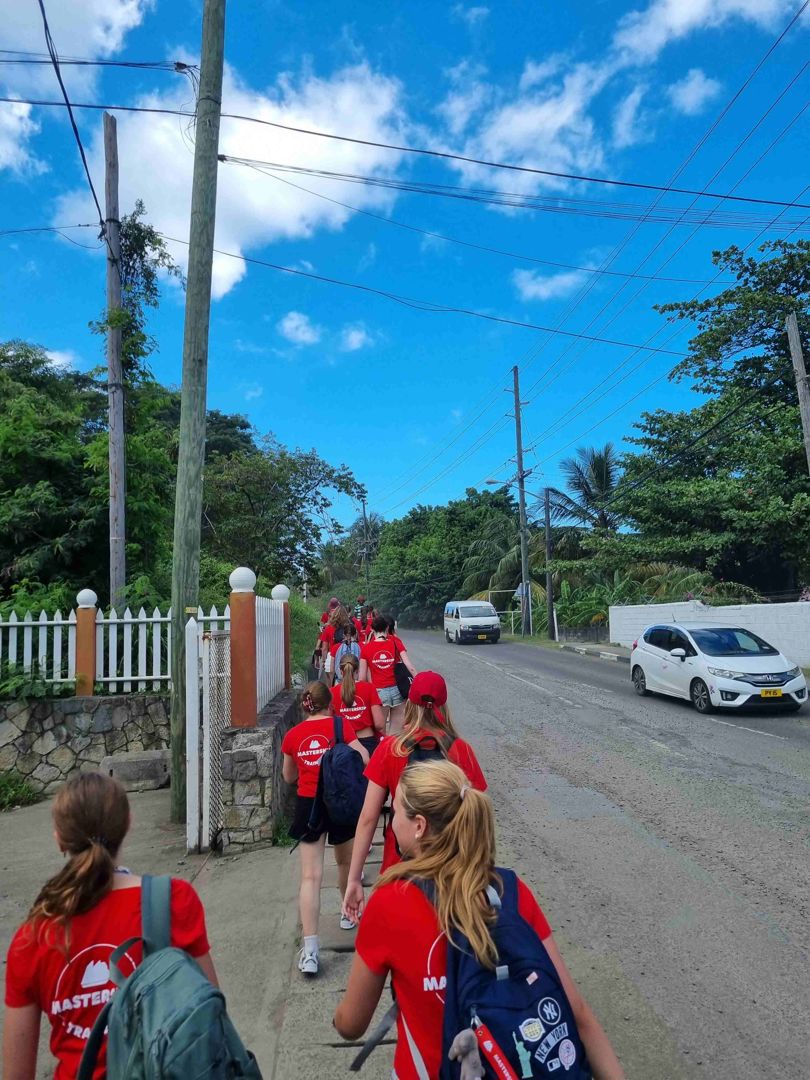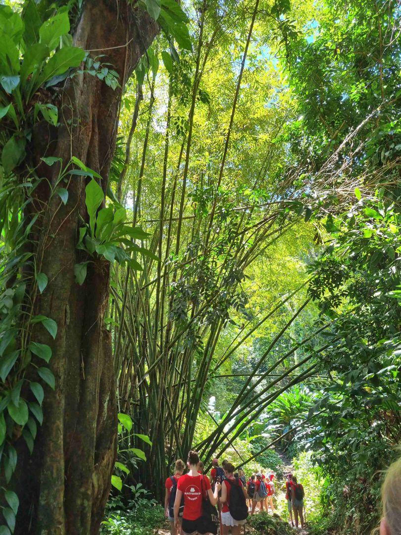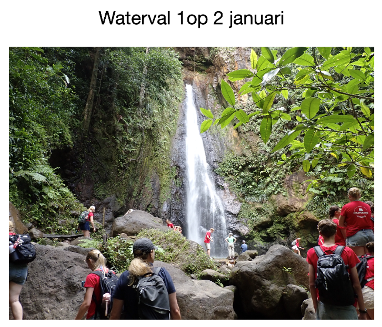 2 januari: Onze dag begon vroeg namelijk al om 6.00, één uur eerder dan normaal, maar nog steeds wel vroeg. Ontbijt was om half 7 ongeveer. Toen gingen we onze spulletjes pakken. En daarna begon onze vol geplande maar wel mega leuke dag. We tenderden naar een kleine aanleg plek voor bootjes en na even wachten kwamen 3 bussen waar over we werden verdeeld. We gingen namelijk in 1 dag het hele eiland verkennen dus de bussen waren heel handig. Onze eerste stop was bij een supermarkt want iedereen wilde natuurlijk wel wat lekkere snacks voor onderweg. Maar de eerste echte stop was bij het begin van een hike plek. Dus wij gingen hiken en voor dat we het wisten konden we al een waterval horen. Eenmaal aangekomen was het echt super super mooi. Sommige doken gelijk het water in, andere gingen even genieten van het uitzicht met onze lunch, een pita broodje. Het was heel indrukwekkend de waterval was denk ik wel 15 meter hoog met heel mooi helder water omringt door natuur. Daar bleven we ongeveer een half uurtje voordat we weer verder op avontuur gingen. Na weer even in de bus zitten kwamen we aan bij een barretje, dus iedereen ging gelijk even naar de wc en toen weer door. We moesten even kort lopen maar toen kwamen we aan bij een super mooi uitzichtpunt. Met allemaal rode stenen, die zijn rood omdat er heel veel ijzer in zit. Er waren ook mooie bomen en onder ons was de prachtige blauwe zee. Een perfect plaatje dus. Iedereen ging natuurlijk gelijk fotos maken en genieten van het uitzicht. Dat was super fijn. Daarna was het tijd voor wat cultuur namelijk…… een chocolade fabriek!!!! Dat was mega leuk om te zien en super lekker. We mochten allemaal een stukje proeven bij het winkeltje en veel hebben ook souvenirs gekocht en natuurlijk chocolade. Daarna kregen we een tour van een mevrouw die daar werkte. Ze nam ons mee in het proces, dat was heel leuk om te zien. Ze vertelde over de cacaobomen die ze daar hebben, over het fermentatie process wat er allemaal in chocolade gaat. Heel interessant en leerzaam. Toen was het tijd voor iets wat wij allemaal waarschijnlijk nooit meer gaan doen. Eerst zaten we ongeveer 1,5 uur in de bus en toen kwamen we aan, moesten we een zwemvest aan doen en gingen we naar een waterval zwemmen!!!! Dat was best wel eng voor veel mensen het was namelijk heel koud omdat we hoog in de bergen zaten. En het was heel donker omdat we in een soort grot moesten zwemmen die alleen aan de bovenkant open was en daar was dan jungle. We hebben vleermuizen, vogels en krabben gezien. We mochten toen we aankwamen allemaal even onder de waterval staan, dat was best wel spannend maar wel heel mooi. Iedereen was hier echt heel erg onder de indruk door, want het was echt heel mooi. Toen was het tijd voor de terugreis naar de tender-plek. Dat duurde ongeveer 1,5 uur het was heel gezellig in de bussen, en veel hebben ook even geslapen en natuurlijk genoten van het uitzicht. Eenmaal aangekomen op de boot gingen de meeste wat eten en toen lekker slapen na zo een indrukwekkende dag.